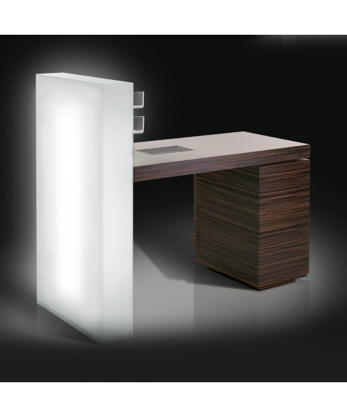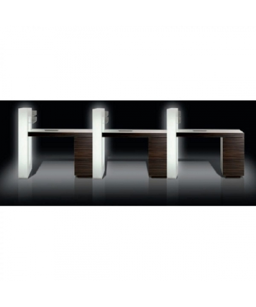 Маникюрный стол "Gloss" - стол для проведения маникюра с артикулом G-м60003195 с прямоугольной толстой столешницей и встроенной вытяжкой , со сменным фильтром (вариант без вытяжки). Одна сторона стола оснащена тумбой с двумя выдвижными ящиками, другая - панелью из оргстекла с двумя полками и подсветкой. Используемый материал для маникюрного стола - ламинат в различной цветовой гамме.