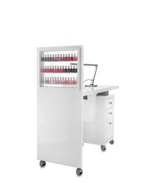 Стол маникюрный "308 LX DISPLAY" - с одной тумбой. Маникюрный стол с артикулом A-м60003105 оснащен витриной с тремя полками из оргстекла. Витрина имеет размер 41x35 см и позволяет разместить около 40 флаконов. Тумба маникюрного стола оснащена тремя выдвижными ящиками и колесами со стопорами для удобства перемещения. В комплекте: лампа, валик маникюрный, подставка под лаки, вытяжка AR5 Superturbo 60W.