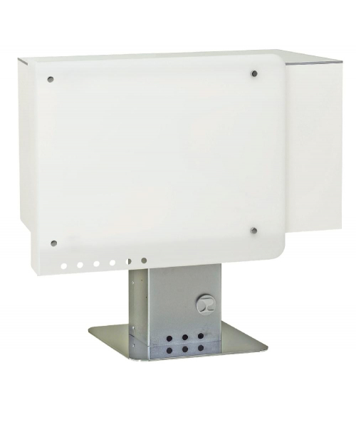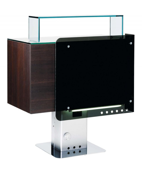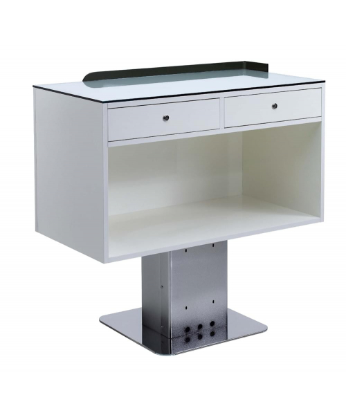 Рецепция прямоугольной формы, выполнена из ламината цвета венге или белого, с двумя выдвижными ящиками, на одной металлической ножке. Передний фасад выполнен из стекла. Возможен вариант с подсветкой.