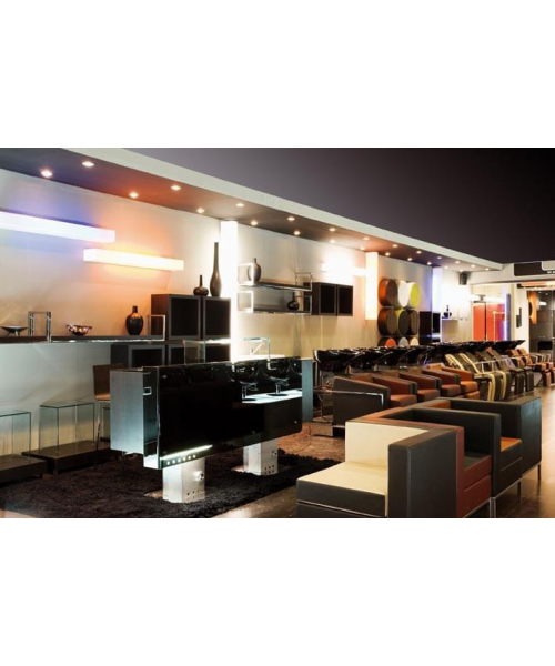 Рецепция прямоугольной формы, выполнена из ламината цвета венге или белого цвета, с четырьмя выдвижными ящиками, на двух металлических ножках. Фасад выполнен из стекла. Возможен вариант с подсветкой.