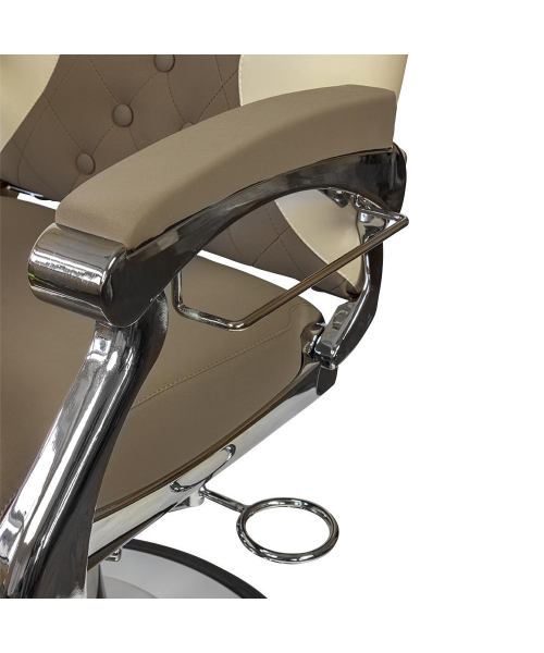 В комфортабельном кресле каждый клиент сможет расслабиться на время проведения процедур. Кресло оснащено большой удобной подножкой с мягкой подушкой, обеспечивая комфорт ногам клиента. Приятное дополнение мебели для барбершопа – практичный держатель для фена, расположенный на нижней части сидения. Стиль кресла подчеркнут декоративной прошивкой и большими пуговицами на спинке и подножке.