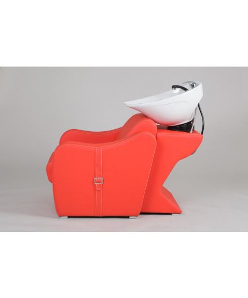 Подстраиваясь под клиента, раковина поднимается и опускается, принимая нужное положение. Стильное основание изготовлено с эргономичной спинкой и удобными мягкими подлокотниками, сиденье – широкое: все для того, чтобы клиенту было максимально комфортно. Боковая часть оформлена элегантным ремешком с пряжкой, по краю материал оформлен качественной строчкой – эти нюансы делают модель красивой и современной, моментально привлекая внимание посетителей.