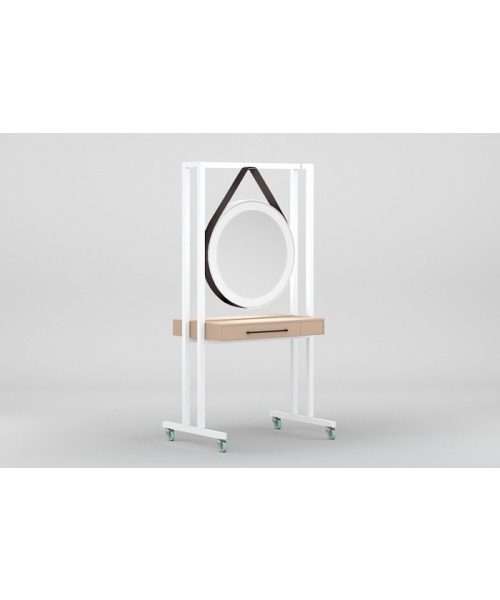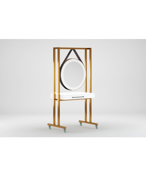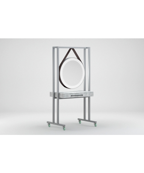 Металлический корпус, покрытый порошковой краской, вместительная столешница, ящики с каждой стороны для удобного хранения парикмахерских принадлежностей. Прорезиненные профессиональные колёса и возможность оборудования розеток для электроинструмента, обеспечивают высокую мобильность и удобство работы.