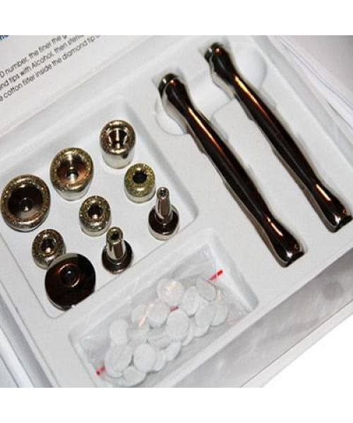 • Алмазная микродермабразия – удаление ороговевших клеток и механических загрязнений с поверхностных слоев эпидермиса, проводящееся как предварительная процедура для улучшения поступления активных компонентов косметических препаратов, так и процедура самостоятельная. Выравнивает рельеф кожи, сглаживает рубцы, устраняет гиперпигментацию и многое другое. Комплектация включает девять видов алмазных фрез разного диаметра и разной степени абразивности.
