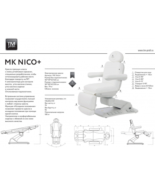 КитайКушетка косметологическая, кресло "МК145 NIKO TEllA" подходит для массажа и косметологических процедур. Регулировка спинки, высоты, угла наклона и ножной секции осуществляется четырьмя электромоторами с пульта управления, дублирована кнопками на корпусе и педалями в основании, функции исходного положения/ блокировки.