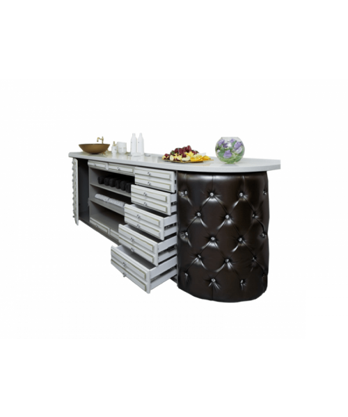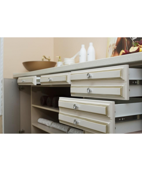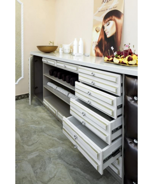 Лаборатория оборудована удобными открытыми полками и выдвижными ящиками и может быть дополнена мойкой из нержавеющей стали. Данный предмет интерьера позволит поместить все необходимые средства для работы наиболее оптимальным способом.
