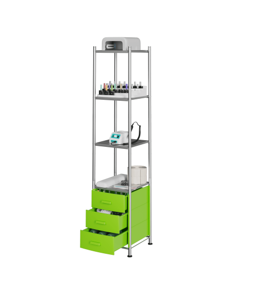 Стеллаж "Lino-3" – компактное и одновременно вместительное место хранения косметических средств и инструментов, необходимых в работе. Открытые полки позволяют удобно расположить оборудование, которое должно быть под рукой. Закрытые выдвижные ящики служат местом хранения мелочей, аппаратов и сопутствующих предметов. Стеллаж позволяет поддерживать порядок на рабочем месте, при этом не занимает много места, помогая эффективно организовать пространство.
