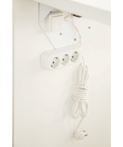 Тумба оснащена тремя выдвижными ящиками, нижний ящик идеально подходит для хранения высоких флаконов. Дополнительно стол оснащен тройной розеткой и удлинителем.