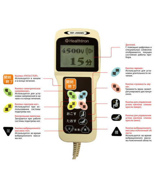 Во время процедур HEALTHTRON HEF-J9000MV можно использовать как обычное кресло с подставкой для ног, а в случае, если Вам хочется большего комфорта, спинка легко опускается при помощи пульта управления. С помощью таймера Вы всегда сможете выбрать нужную длительность процедуры – 15, 30, 45 или 60 минут, и напряжение поля – 4500 или 9000 вольт. Для того, чтобы позволить Вашему организму привыкнуть к процедурам HEALTHTRON HEF-J9000MV, следует соблюдать наши рекомендации по использованию. Первая неделя: низкое напряжение (4500В) - 30 минут Последующая неделя: низкое напряжение (4500В) - 60 минут Затем, если вы продолжаете пользоваться Healthtron: Последующая неделя: высокое напряжение (9000В) - 30 минут Последующая неделя: высокое напряжение (9000В) - 60 минут К креслу прилагается полная инструкция по использованию на русском языке с описанием всех функций системы HEALTHTRON HEF-J9000MV.