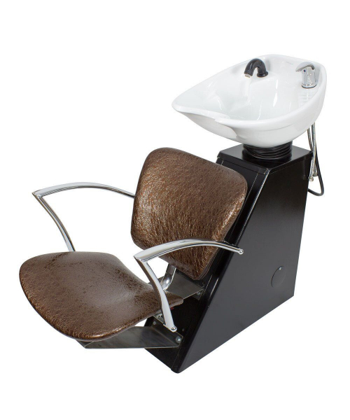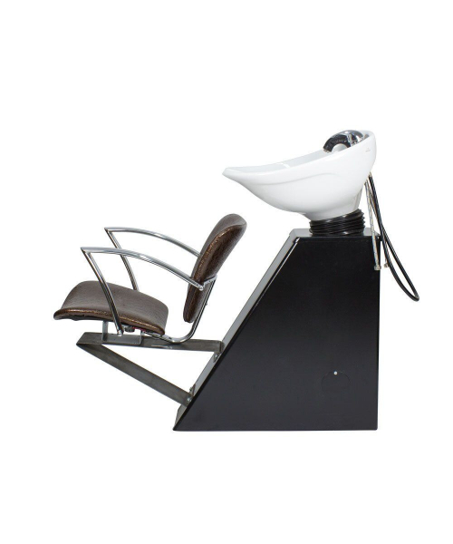 Кресло установлено на металлический каркас мойки. Сверху на каркасе установлена средних размеров раковина со всеми необходимыми коммуникационными элементами. Ее положение можно регулировать, подстраивая под конкретного клиента для большего удобства. Цветовые решения и комплектацию данной модели можно выбирать в зависимости от собственных предпочтений.