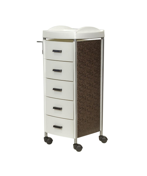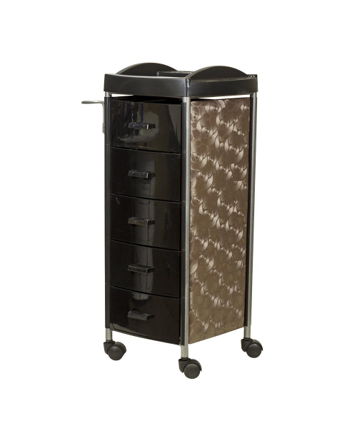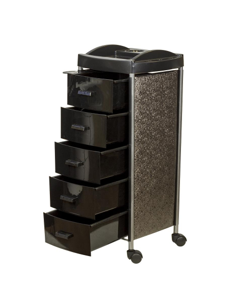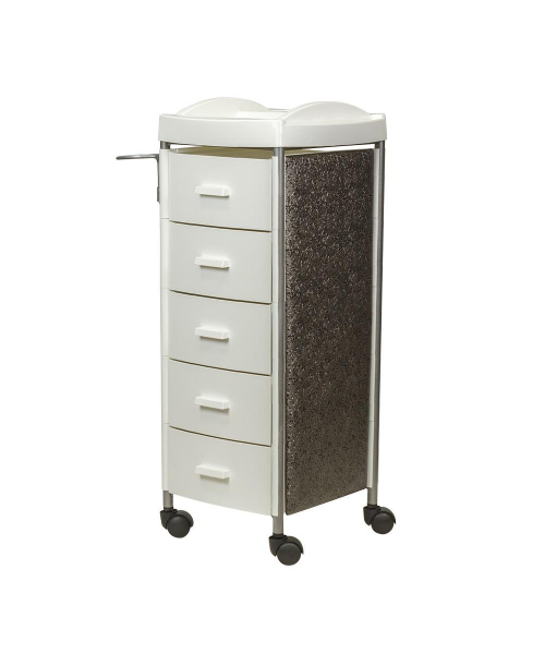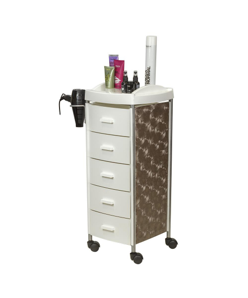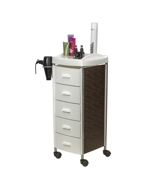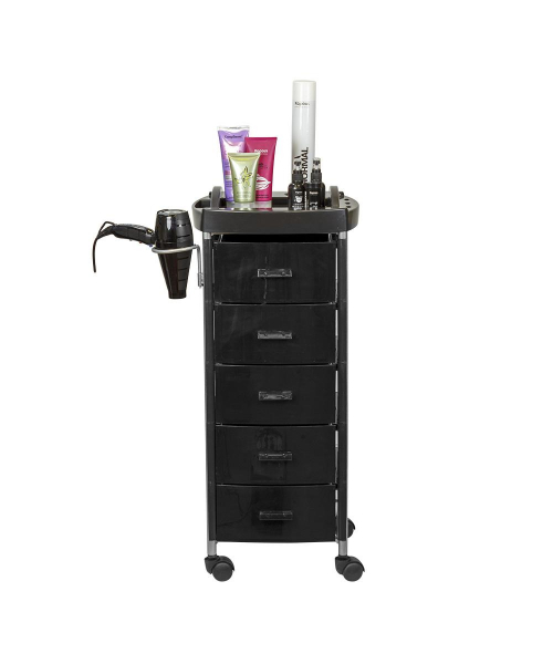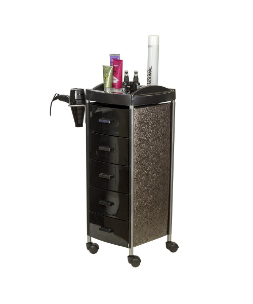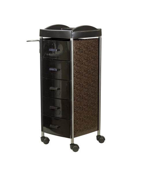 В компактной тележке достаточно места для хранения приспособлений мастера. Для инструментов, аксессуаров и косметики в конструкции предусмотрено пять глубоких ящиков. Верхняя полка послужит во время процедур окрашивания. В крышке предусмотрены отверстия для кистей, емкостей для красок и площадка для инструментов. На крышке установлен удобный фенодержатель. Боковины из экокожи придают тележке красивый внешний вид. Для быстрого перемещения оборудование оснащено шестью маневренными колесами.