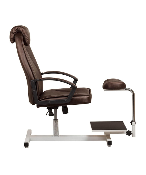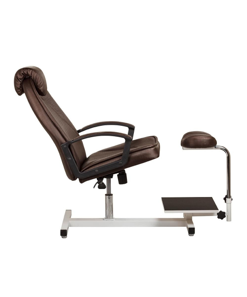 Это удобная, элегантная, современная модель. Эргономичная форма кресла создана при помощи мягкого матраса и подголовника из синтепона, что позволяет клиенту чувствовать себя максимально комфортно во время длительных процедур. Регулировка высоты кресла происходит при помощи гидравлической колонны. Кресло установлено на металлический каркас, который оборудован педикюрной подставкой и подставкой под ванночку. Габариты: 61(Ш) x 110(В) x 134(Г)
