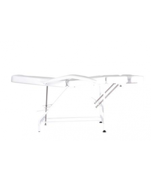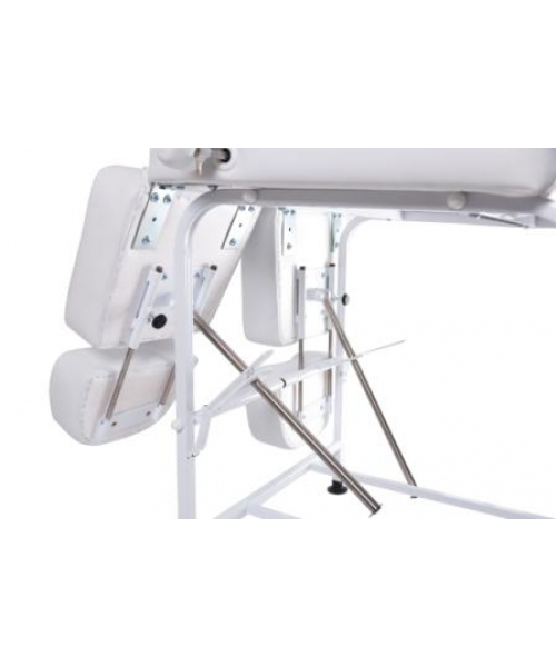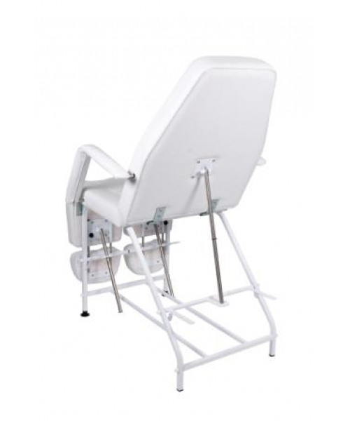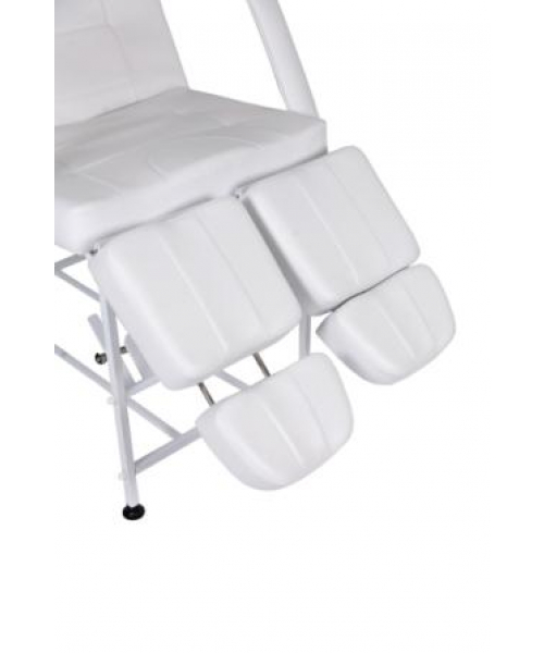 Опоры для ног раздельные, можно регулировать по высоте и длине в зависимости от роста клиента. Кресло раскладывается в горизонтальное положение для проведения косметологических процедур.