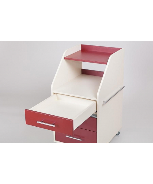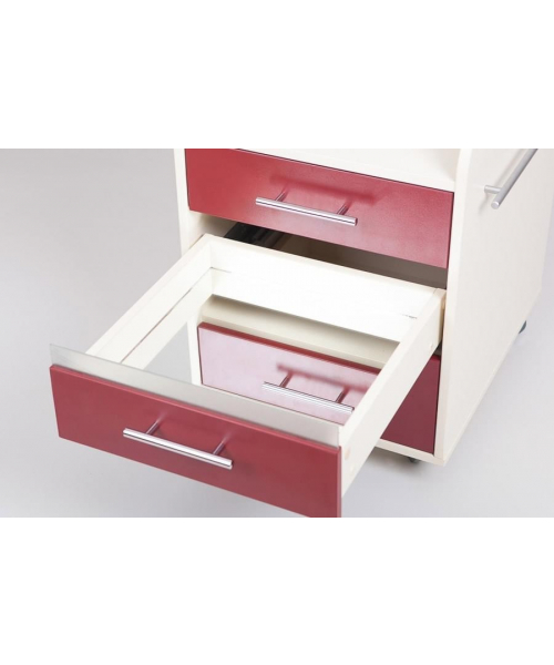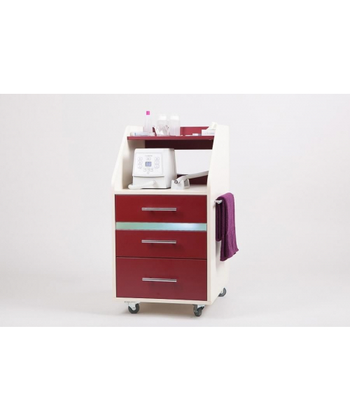 Косметологическая тележка Атика имеет три выдвижных ящика, средний оснащен УФ-модулем с бактерицидной лампой стерилизации инструментов. На правой стенке размещен рейлинг для полотенец. Наверху имеются две открытые полки, где можно разместить косметологическое оборудование и аппаратуру.