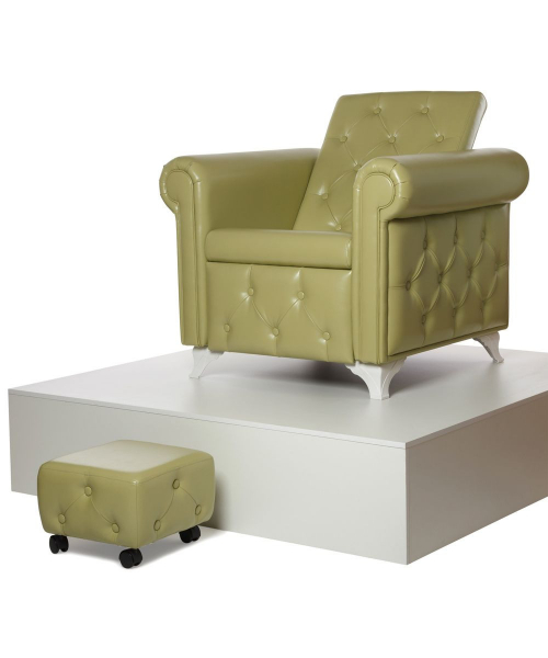 Удобный пуф для мастера маникюра на колесах с декоративными пуговицами, которые украшают внешнюю часть пуфа.