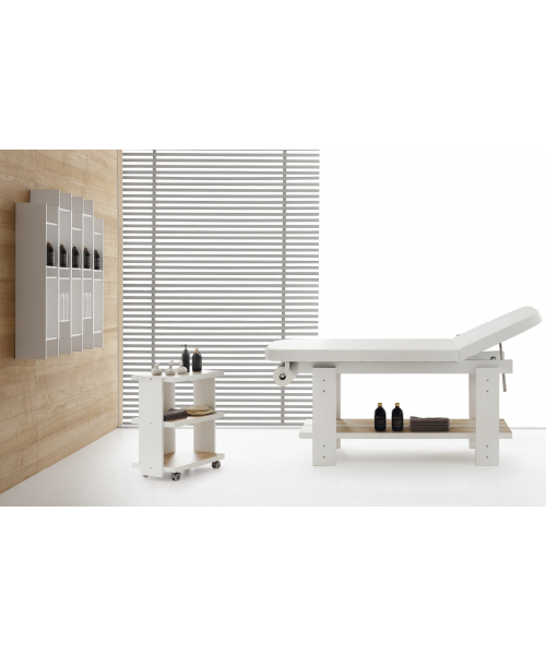 Массажная кушетка "Living" -  это массажная кровать, выполненная в матово-белом цвете с полкой на основании, доступной в трех различных вариантах отделки.