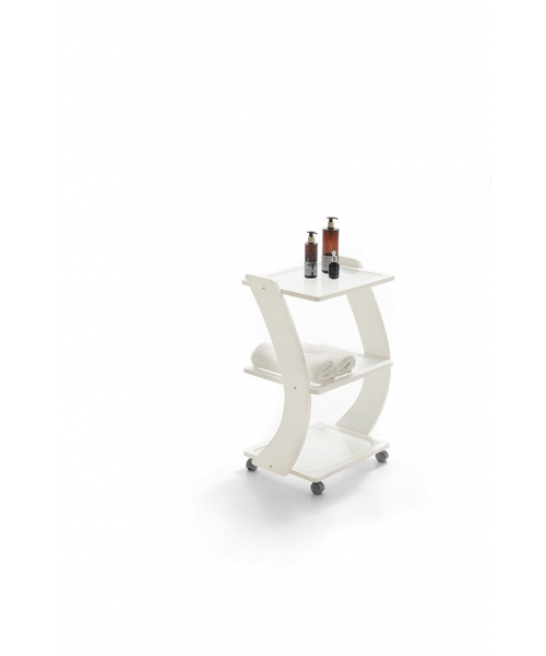 Это сочетание необычного дизайна и функциональности. Модель изготовлена из натуральной древесины березы и доступна в двух вариантах – с полками из дерева и с полками из стекла. Деревянные полки могут быть выполнены в нескольких цветовых решениях – грецкий орех, венге, выбеленный клен. Стекло используется прозрачное. Полки выполнены в форме квадратного поддона и подходят как для хранения различных СПА-средств, так и полотенец. Производителем предусмотрены колесики, за счет которых тележку можно легко перемещать. Модель отличается надежностью, износоустойчивостью и долговечностью.