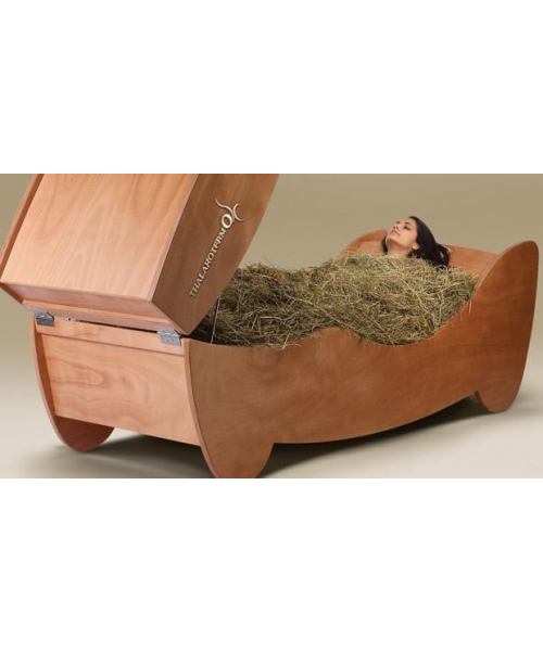 Паровая кабина в виде кушетки-шезлонга из дерева окуме для влажных процедур.